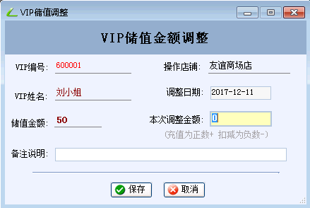 店家乐服装连锁管理软件系统,开启了VIP会员储值功能后,可在“VIP会员管理-VIP储值调整”界面中调整VIP会员的储值金额。